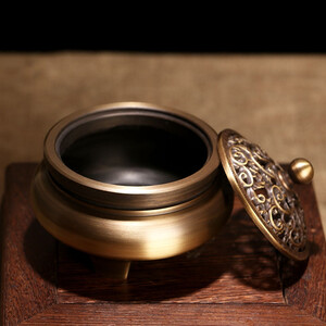 圆润的纯铜香炉,炉上雕刻富贵花纹,造型别致妙不可言。仿古拉丝工艺,边角转折处摸着圆润,匠人打造富有古意。
