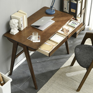 这是一款极简造型的书桌,实用性强,适合大多数人使用。配以宽大的实木桌面,不易开裂变形,结实又耐用。