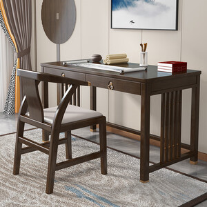 新中式风格实木书桌,采用泰国进口橡胶木制作,坚固耐用纹理美观,宽大桌面设计办公学习更加舒适更加轻松。