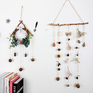 选用天然树枝,纹理自然美观,令人爱不释手;干花与木质挂坠的分布错落有致,富有层次感,为整体设计添墨加彩。