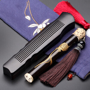 以紫光檀为原料,精工细制,质地坚硬,颇具质感。以伏羲古琴为原型,整体色彩惊艳,很有创意。