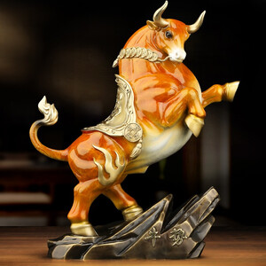 腾气的牛造型,具有扭转乾坤之意,寓意事业红红火火,牛气冲天。融合了火焰、铜钱等元素,丰富整体造型感。
