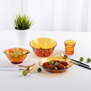 精美琥珀色餐具套装,色调时尚复古,造型简约大方。选用优质钢化玻璃材质制作,耐高温低温,使用寿命更长久。