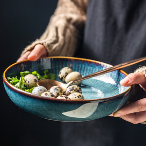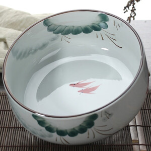釉下彩手绘工艺,鱼儿自由自在的游,勾画出一副山水画,如此景象映衬在汤碗上。