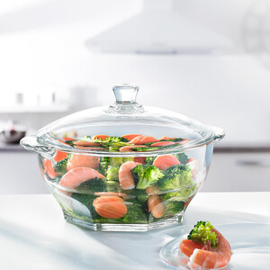 加厚玻璃打造,盖子边缘平滑不易伤手,双耳把手设计,端拿更方便,碗身晶莹剔透,坚固耐用。