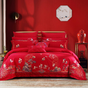 精选40S全棉面料,光泽亮丽,兼具美观与舒适性。搭配百子绣花图案,具有多子多福的寓意,代表对新人的美好祝福。