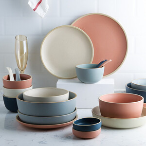 舍里哑光简约餐具,采用莫兰迪系列作为餐具4种颜色,欧式风格,哑光釉面质感突出,整体造型时尚美观,16头组合。