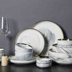 裕行北欧金边餐具,结合现代设计元素,简洁明亮的外观器型,金线描边,视觉上给人舒适的美感,33头组合。