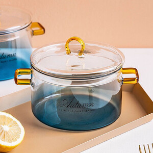 采用玻璃材质,渐变蓝和柠檬黄的设计,食物显得更有食欲;采用双耳把手设计,线条流畅圆滑,能够更好保护双手。